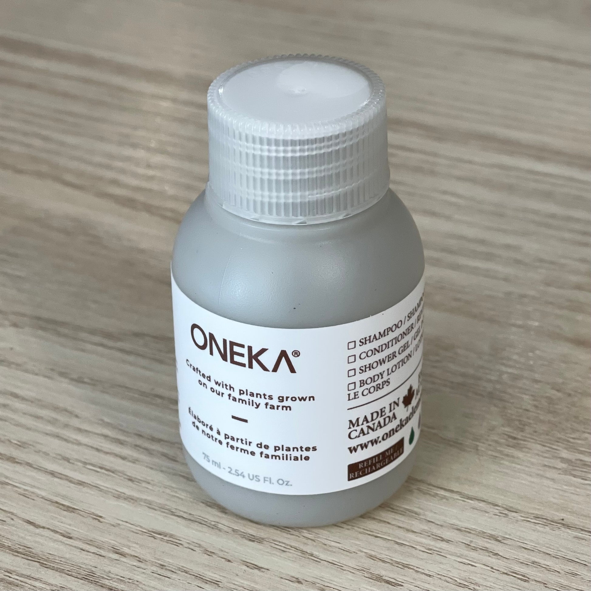 Bouteille en plastique rechargeable Oneka, idéale pour essayer des produits en petite quantité ou comme format voyage. L'étiquette générique permet de cocher le produit et l'arôme.